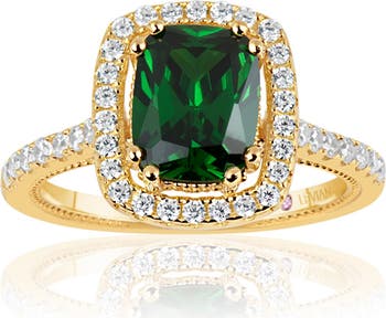 - Yellow rhodium plated sterling silver halo set white CZ with cushion-cut green CZ center stone and round-cut white CZ embellished shank ring