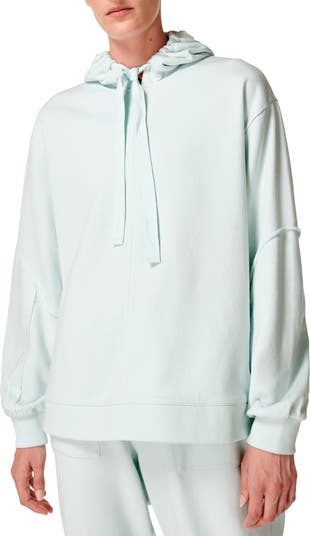 Thin drawstrings dangle from the neckline of this comfy cotton-blend hoodie framed by dropped shoulders.