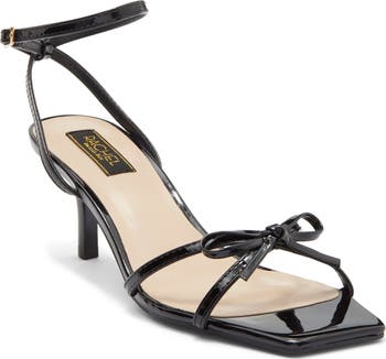 A dainty bow highlights this glossy ankle-strap sandal framed by a squared open toe and slender heel.