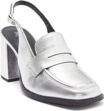 A colorblocked design underscores the polished look of this loafer-inspired slingback pump framed with a square apron toe and flared block heel.
