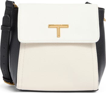 Show off chic style with this structured faux-leather crossbody bag framed by a fold-over flap and gleaming logo hardware.