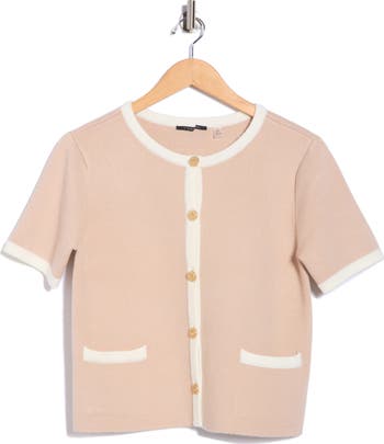 High-contrast trim and a row of polished buttons define a cuddly sweater framed by short sleeves for season-spanning comfort.