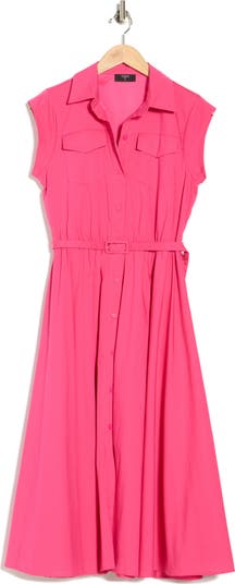 Transition from the workday to weekend in this cap-sleeve shirtdress cut from crisp cotton-blend poplin in a charming fit-and-flare silhouette.