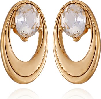 Faceted bright-white crystals deliver pretty sparkle to elongated earrings made with an easy clip-on back.