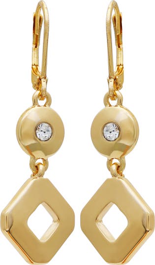 Pretty crystals amplify the shimmer and shine of polished earrings that suspend geometric-shaped drops for visual intrigue.