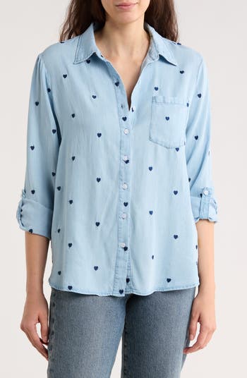 Embroidered hearts lend sweet style points to a button-up shirt crafted entirely from sustainable fabric for a feel-good fit.