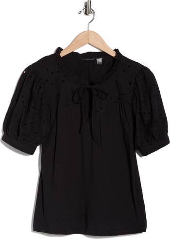 A ruffle-tipped collar and intricate embroidery with eyelets sweeten the vibe of this crisp cotton peasant top constructed with short sleeves and a relaxed, flowing hem.