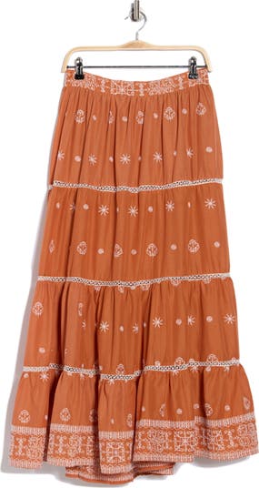 Contrasting embroidery brings bohemian charm to a tiered skirt cut from pure cotton for a lightweight feel even as the temp rises.