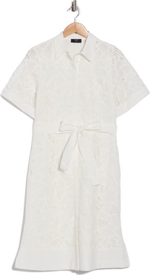 Airy eyelet embroidery adds extra charm to a pure-cotton dress shaped with a cinching tie waist.