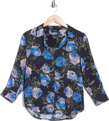 An artistic floral print brightens this lightweight button-up shirt framed by three-quarter sleeves and a curved hem.