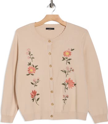Exude charming style in this lightweight cardigan featuring pretty embroidered flowers and dainty scalloped trim.