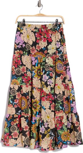 A vibrant floral print and eyelet embroidery decorates this tiered maxi skirt cut from airy cotton.