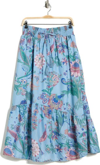 Elevate your off-duty ensembles with this pull-on skirt covered in vibrant blooms and styled with a smocked waist.
