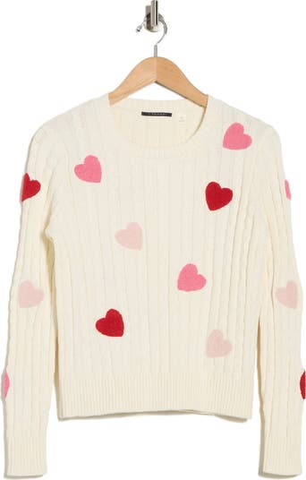 Feel the love in this lightweight cable sweater peppered with fuzzy hearts for a delightful look in any season.