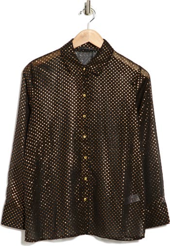 Gleaming buttons and metallic dots add party-ready sparkle to this flowy chiffon button-up shirt.