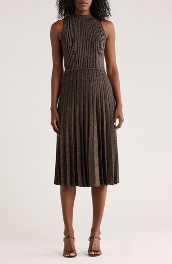 Soft ribbing textures the bodice of this mock-neck midi made with a flowy pleated skirt and sprinkled with celebratory shimmer.