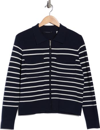 Bold stripes bring classic style to this soft knit sweater-jacket sporting a front-zip closure and chest utility pockets.