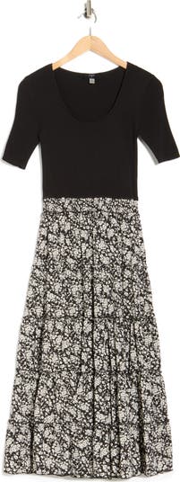 A knit bodice flares out into a woven, floral-patterned skirt in a mixed-media dress that delivers a layered look with one-and-done ease.