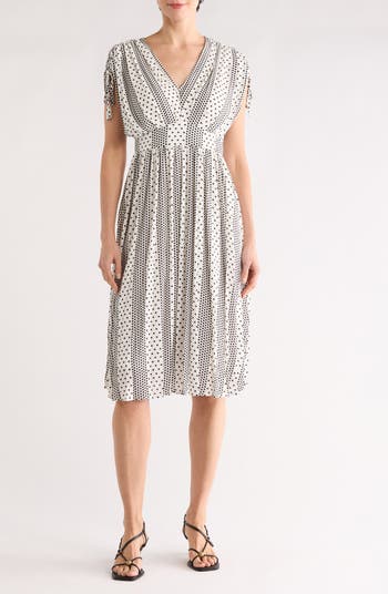 Dainty polka dots pepper this charming A-line midi dress framed by an Empire waist and dolman sleeves with ruching ties.