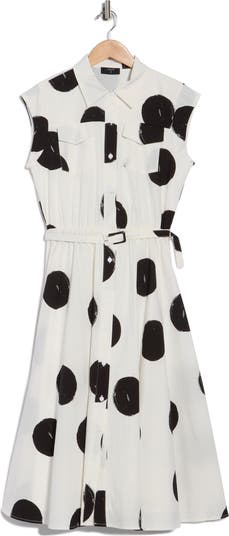 Large polka dots pepper this sleeveless shirtdress cut in a charming fit-and-flare silhouette and styled with a slender waist belt.