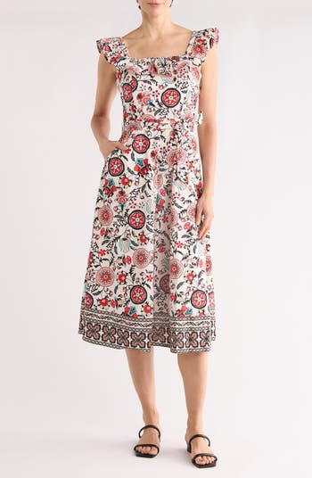 A ruffled neckline and cap sleeves enhance the boho charm of this floral midi dress fashioned in a graceful A-line silhouette.