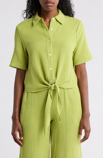Stay cool on warm days in this short-sleeve button-up shirt constructed from breathable cotton gauze and finished with a flirty front-tie hem.