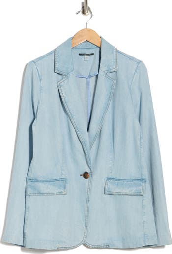 A tortoise-pattern button fastens this clean streamlined blazer cut from light-washed chambray fabric and framed with notched lapels.