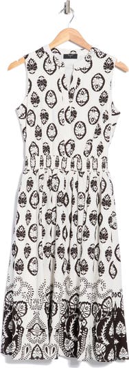 Refresh your workday rotation with this midi dress covered with a medallion print and styled with a smocked waist.