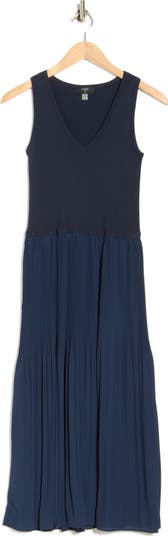 A knit bodice flares out into a knit, tiered skirt on a mixed-media dress that delivers a layered look with one-and-done ease.