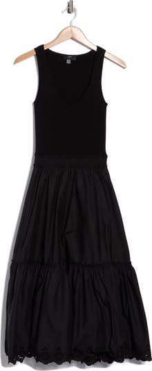A fitted sleeveless knit bodice flows seamlessly into a full tiered skirt, giving this dress a top spot during your workweek or weekend gathering.