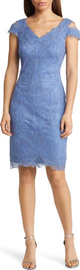 A figure-enhancing sheath exquisitely fashioned from embroidered lace with cold-shoulder cutouts is perfect for weddings, cocktail parties and date nights.