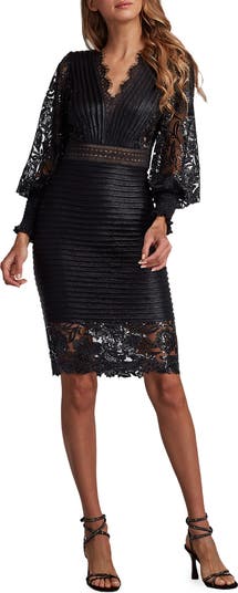 Sequins and lace elevate this figure-skimming dress designed with textured pleats and billowed smocked-cuff sleeves.
