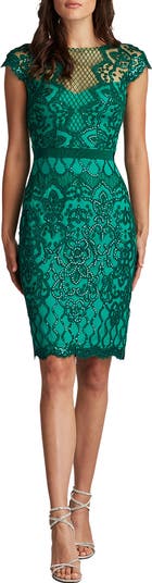 An elegant frock exquisitely fashioned from ornate lace sparkling in tonal sequins is perfect for weddings, cocktail parties and date nights.