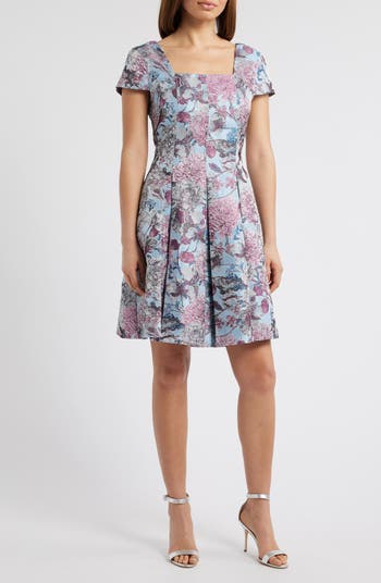 Formal flowers and structured pleats elevate a romantically square-necked dress designed in a beloved fit-and-flare silhouette.