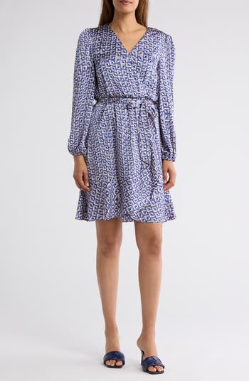 Satin fabrication gives subtle shine to this long-sleeve wrap dress cut with a ruffled skirt that swishes and sways with your every movement.