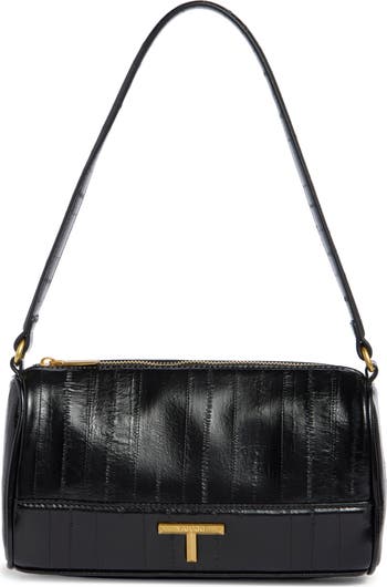 Carry your essentials in this compact faux-leather shoulder bag accented by striped topstitching and gleaming logo hardware.