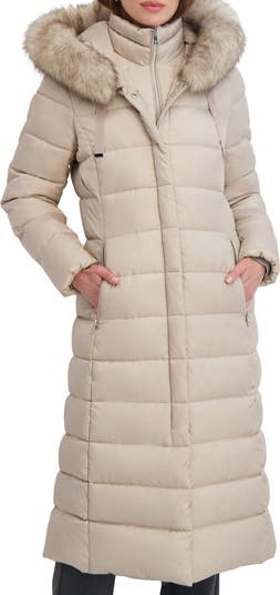 Stay warm on cold days in this hooded puffer jacket fashioned with fluffy faux-fur trim, a cozy interior bib and lightweight down-alternative insulation.