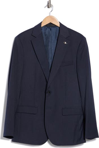 A textured weave and sharp tailoring define this slim-fit blazer finished with notched lapels and ample pockets.