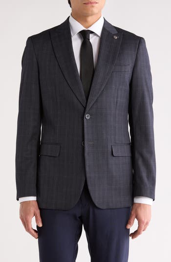 A textured plaid pattern and sharp tailoring define this slim-fit blazer finished with peaked lapels and ample pockets.