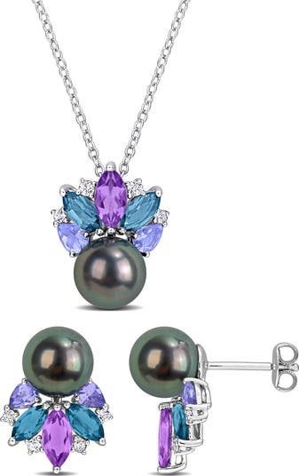 Marquise-cut tanzanite, amethyst and blue topaz interspersed with round-cut white topaz fan out from the black Tahitian pearls of this elegant set featuring a sterling silver pendant necklace and a pair of matching stud earrings.