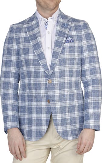 Elevate your wardrobe with this blue plaid linen-blend sport coat constructed with notched lapels and patch pockets for contemporary style.