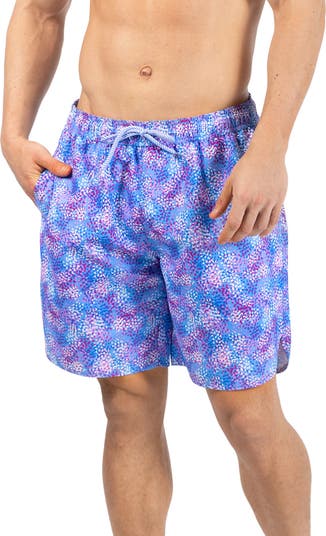 Move comfortably from sand to surf in these moisture-wicking swim trunks built with sun protection and covered in a bold brushstroke print.