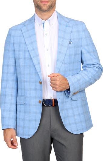 A shadow plaid pattern defines an all-occasion sport coat styled in a modern silhouette with a bold inner lining that matches a handkerchief and signature Tailorbyrd pin.