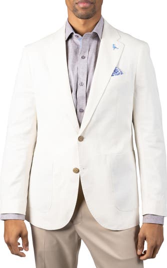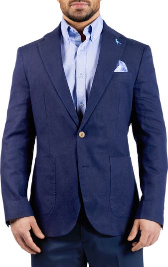 This textured, linen-blend sport coat features a two-button design, a signature flamingo lapel pin and a boldly patterned handkerchief that adds standout personality to your look.