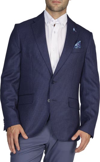 Upgrade your well-dressed staples with this modern sport coat that features an eye-catching print, patterned handkerchief and Tailorbyrd pin.