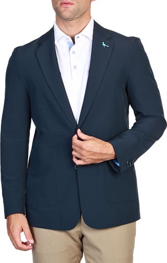 Top off your dapper look with this suave solid travel sport coat styled with a signature removable Tailorbyrd lapel pin.