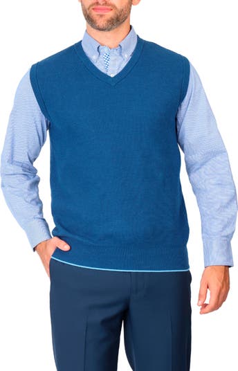 A great layering piece, this waffle-knit sweater-vest is knit from soft cotton-rich yarns and framed by a striped ribbed hem.