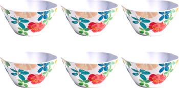 A painted floral design brings an elegant appearance to a set of cereal bowls crafted from durable, dishwasher-safe melamine.