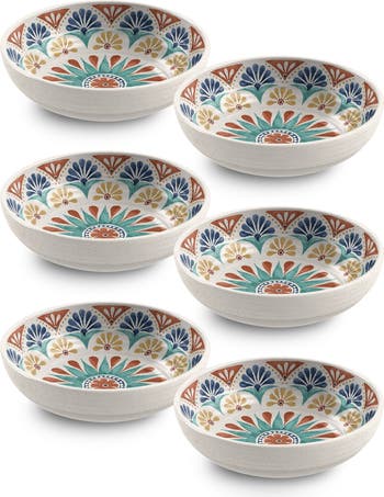 A colorful desert Rio pattern brings an eye-catching finish to this set of low bowls made from durable, dishwasher-safe melamine.