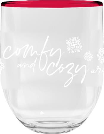 Enhance your tablescape with this set of stemless wine glasses that boast a bright-red rim and holiday-themed script to set the party mood.